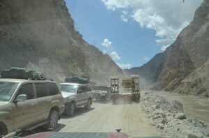 Bam, traffic jam; the Chinese are ‘constructing’ the road here and are placing dynamite in the rocks, they then blow it up at night and the rubble is completely covering the road, nice job.