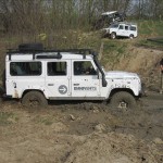 Daarna was het tijd voor het echte werk! In teams van 3 personen en een instructeur. Vijf glimmende Land Rovers stonden klaar bij het terras. Eerst oefenen op vlak terrein om te voelen hoe de auto in de verschillende versnellingen en de hoge en lage gearing werkt.