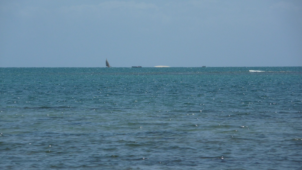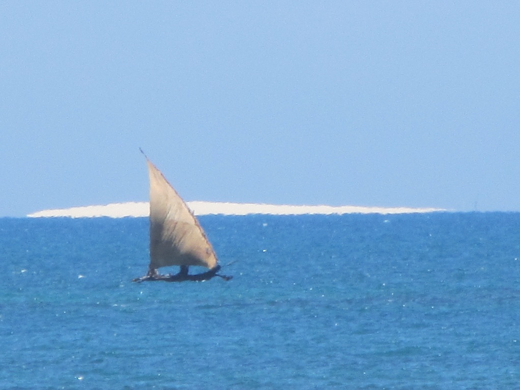 Na een klein uurtje varen komen we aan bij het rif, het anker gaat overboord en na een korte instructie voor Dirk en Trudy gaan we overboord het water is helder en heerlijk warm. Na enige duiken blijkt de uitrusting niet helemaal goed te werken, de snorkels zijn lek, dat is een beetje jammer. Dirk heeft een ouderwetse snorkel gekregen en deze werkt perfect hij heeft enkele mooie vissen gezien. Na nog even aan de andere kant van het rif een duik te hebben genomen is het tijd om te gaan lunchen. De wind is opgekomen en het zeil wordt omhoog gehezen, dat maakt het nog een stuk leuker, geen ronkende motor, de mannen zetten koers richting een klein zand eilandje vlak bij het rif. Nadat ze een tentje hebben gemaakt om wat schaduw te maken worden de koelboxen met drankjes en eten uitgeladen, het is een echt bounty eilandje.